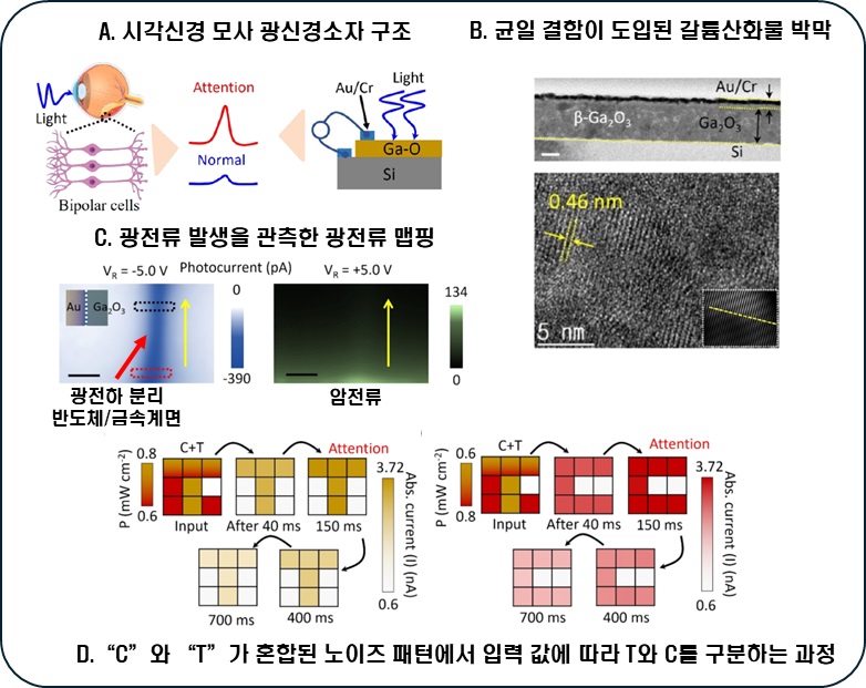 A: 인체 시각신경과 유사하며 광신호의 세기에 따라 인지할 수 있는 정도 조절 B: 위는 단면 전자현미경 사진이며 아래는 확대된 원자결정 사진 C: 레이저 광 조사 하에서 광전류가 어디에 형성되는지 전류 멥핑을 이용하여 관측 D: 문자 C와 T를 혼합하여 광입력 신호를 주었을 때 광 센서의 프로그램을 통해 C를 인지하거나 혹은 T를 인지 및 저장할 수 있고, 이를 적절한 시간 내에서 지우게 할 수도 있다. |